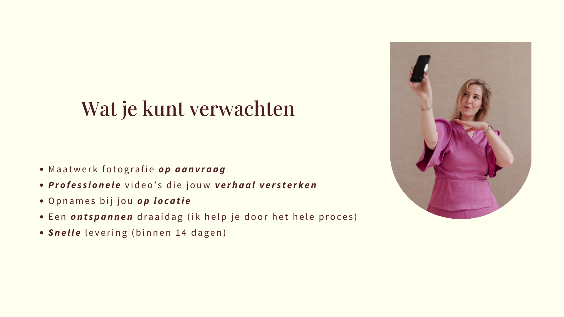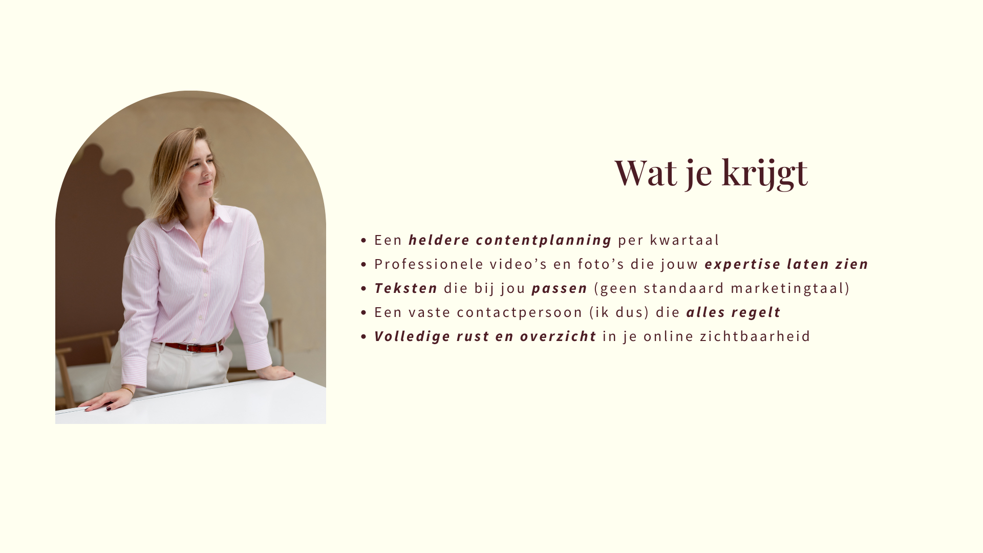 Ik neem het volledige proces uit handen. Van strategie tot uitvoering. Zodat jij zichtbaar bent zonder dat het voelt als een extra taak op je to-dolijst.