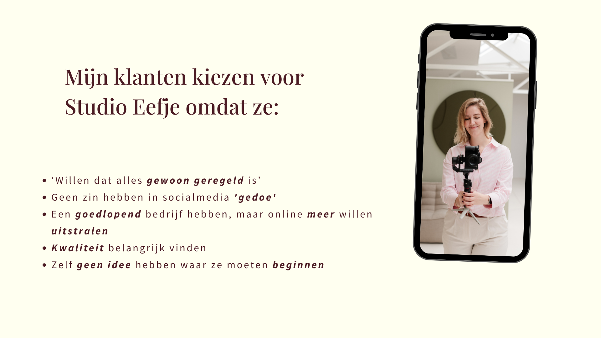 Met Studio Eefje kies je voor social media beheer en video voor ondernemers die rust willen in hun marketing.